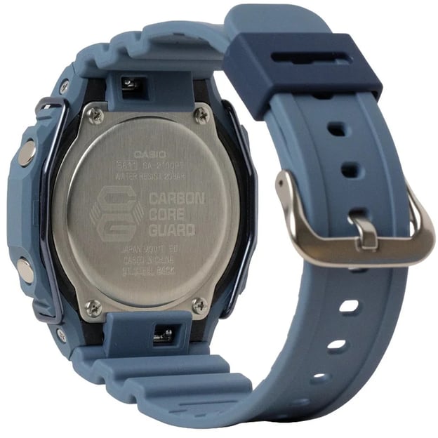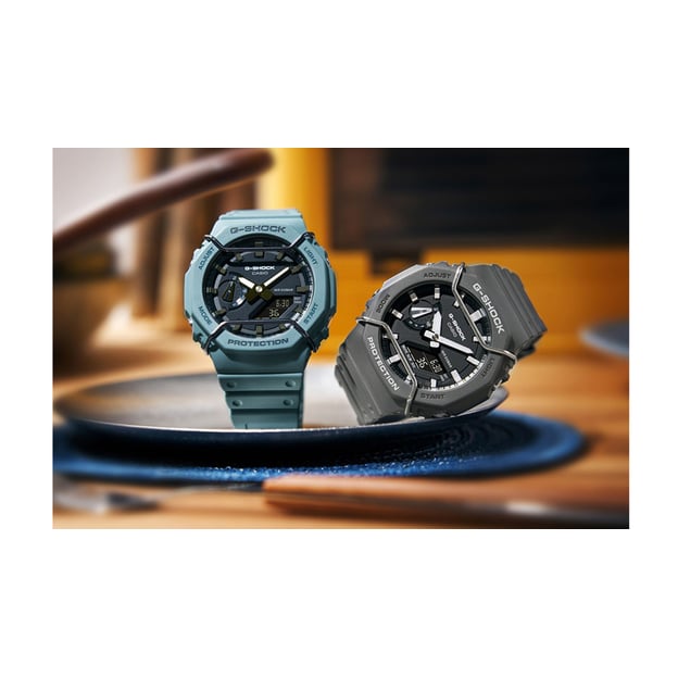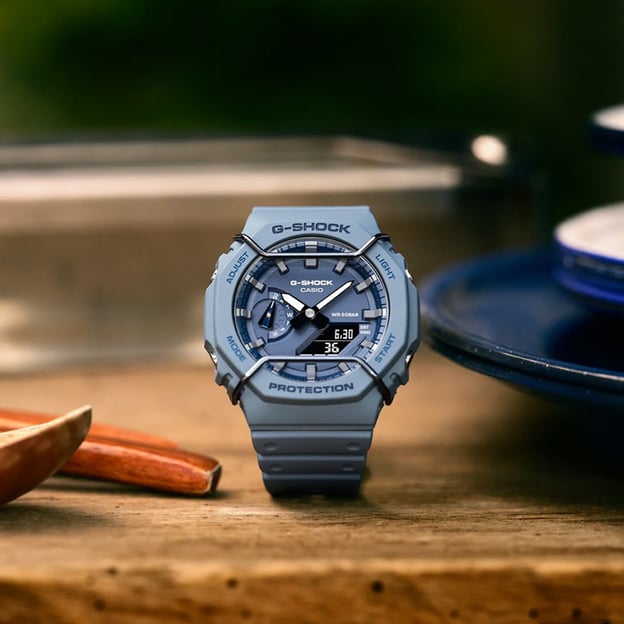 Спортивные японские часы Casio GA-2100PT-2A – ударопрочный G-Shock в матовом дизайне светло-синего цвета с крутой проволочной защитой. Узнаваемый восьмиугольный плоский корпус в коллекции 2022 года имеет металлический протектор, поэтому дизайн каждой деталью подчеркивает свой статус экстремально ударопрочных часов. Содержит множество полезных функций, среди которых мировое время, будильник, цифровой секундомер и таймер. Часы водонепроницаемы – 200 м, поэтому им не страшны водные виды спорта. CASIO GA 2100 благодаря корпусу Carbon Core Guard более устойчивы к ударам, чем обычные часы, а их «внутренности» помещаются в корпус толщиной всего 11,8 мм. GA-2100 – самый тонкий G-Shock за всю историю и максимально комфортный для повседневной носки. Упакованы в оригинальную упаковку производителя в виде металлической банки.