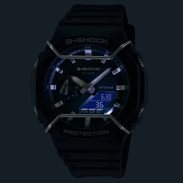 - ДВОЙНАЯ СВЕТОДИОДНАЯ ПОДСВЕТКА. Чтобы с легкостью считать показания часов даже в полной темноте, аналоговый циферблат часов и цифровой дисплей подсвечиваются светодиодом.