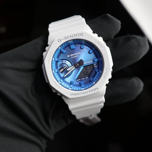 Мужские часы Casio GA-2100WS-7AER – это водонепроницаемый и ударопрочный G-SHOCK в улучшенной версии с защитой Carbon Core Guard из сезонной коллекции 2023 года в новых цветах. Часы с синим блестящим циферблатом металлического цвета напоминают красоту праздничной зимней иллюминации. Модель Casio GA 2100 – часы для поклонников экстремальной прочности G-Shock. В отличие от последних карбоновых моделей, выполнены в более тонком и изысканном корпусе толщиной 11,8 мм — это самые тонкие часы G-Shock за всю историю! Несмотря на обманчиво компактный дизайн, эти часы такие же долговечные и прочные, как и любой предлагаемый G-SHOCK, с водонепроницаемостью 200 метров, ударопрочностью и стойкость к магнитным полям.
