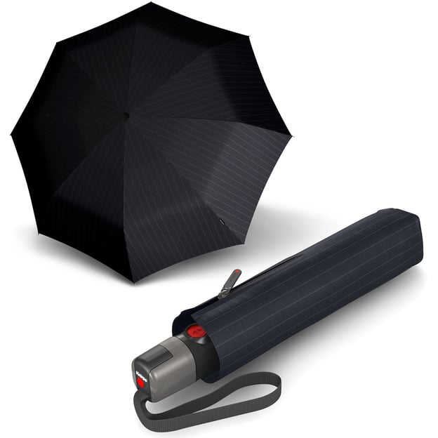 Knirps T.301 Large Duomatic (Men's Prints Stripe/графитовый в полоску) - большой мужской зонт-автомат в классическом дизайне от известного производителя Knirps. Стильная и качественная модель с большим черным в полоску куполом для двоих. Механизм Duomatic для автоматического открытия и закрытия купола одним нажатием большой красной кнопки. Ветроустойчивый складной зонт прошел испытание в аэродинамической трубе на скорости до 120 км/ч. Прочный телескопический шток в 3 сложения. Для купола использован быстросохнущий полиэстер, гарантирующий прочность и износостойкость зонта. Чехол на молнии, чтобы защитить содержимое сумки от влаги. Большая пластиковая ручка дополнена ремешком-петлей и фирменным логотипом Knirps.