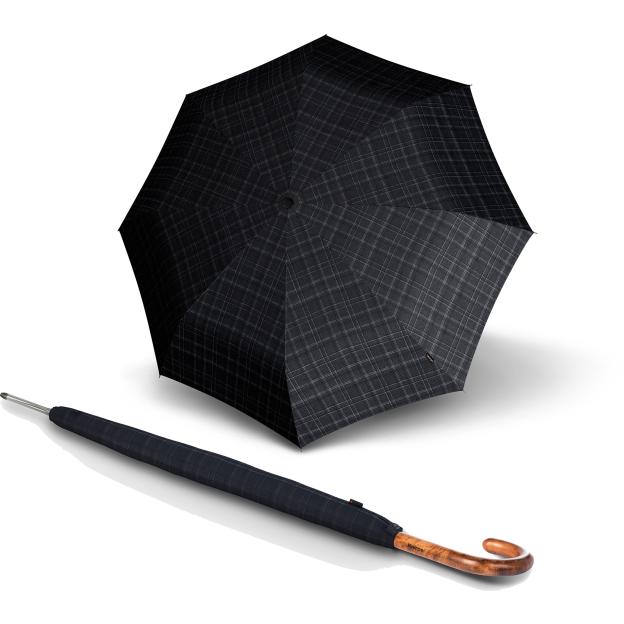 Knirps T.772 Long Automatic (Men's Prints Check/темно-графитовый в клеточку) - классический мужской зонт-трость с деревянной ручкой-крюком от немецкого бренда Knirps. Элегантный дизайн с большим куполом и круглой ручкой-крючком ручной работы из натурального клена. Это делает каждый зонт уникальным. Благодаря полуавтоматическому механизму, заходя в помещение или садясь в машину, вы плавно сложите купол зонта, не намочив себя и окружающих брызгами дождя. Купол изготовлен из полиэстера, который отталкивает влагу и грязь (имеет сертификацию Oeko-Tex Standart 100). Удобно и приятно держать зонт в руке позволяет большая деревянная ручка-крюк. Когда дождь закончился, вы можете элегантно повесить зонт на руку. В комплект входит защитный чехол, который предотвращает повреждение и загрязнение зонта.