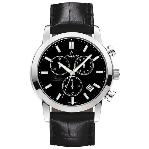 Atlantic SEALINE Chrono 62450.41.61 — мужской хронограф с выразительным черным циферблатом и крупным круглым корпусом из нержавеющей стали. Серебристая отделка корпуса хорошо контрастирует с темным циферблатом, а сапфировое стекло помогает сохранить аккуратный вид при ежедневной носке.