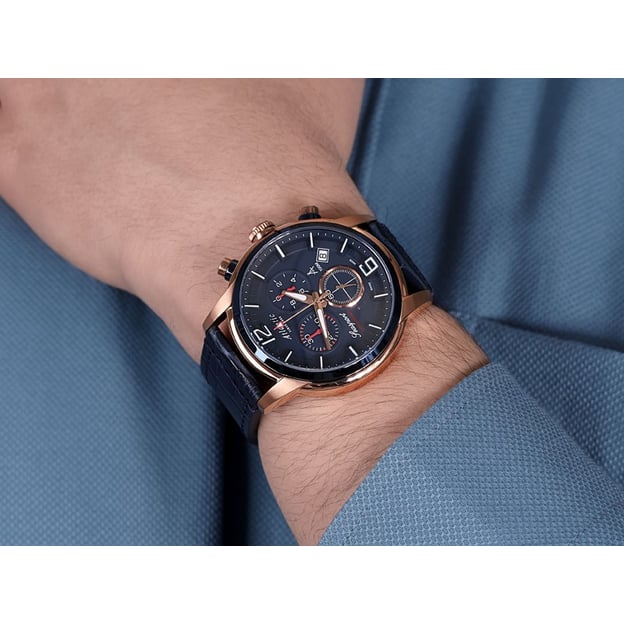 Atlantic SEASPORT Chrono 87461.44.55 — мужской хронограф в круглом корпусе из нержавеющей стали с покрытием под розовое золото. Синий циферблат и синий кожаный ремешок смотрятся сдержано и современно, а крупный диаметр 46 мм делает модель заметной на руке.