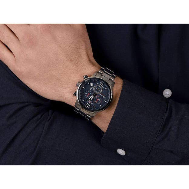 Кварцевый механизм делает модель практичной: время и дата читаются быстро, а функции хронографа под рукой, когда нужно засечь интервал. Люминесцентные стрелки и метки облегчают считывание в темноте. Водозащита 10 ATM (100 м) добавляет уверенности в повседневных делах, а крупный диаметр 46 мм подчеркивает спортивный характер модели.