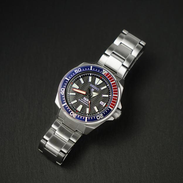 - Сине-красный однонаправленно вращающийся безель с дайверской разметкой.