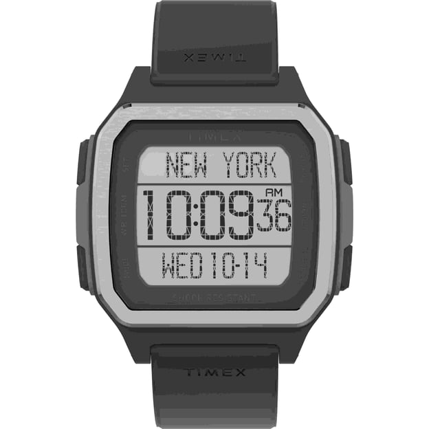 Квадратный черный корпус идеально сочетается с матовым полимерным ремешком угольного цвета.