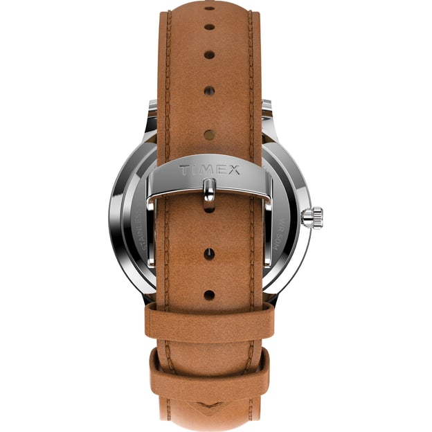 Timex Waterbury TW2U97200 — мужские часы в классическом стиле, которые легко вписываются в повседневный гардероб. Серебристый корпус из нержавеющей стали и круглый циферблат глубокого синего цвета смотрятся сдержанно и аккуратно, а коричневый кожаный ремешок добавляет тепла и делает посадку комфортной.