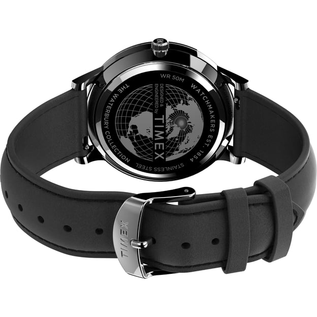 Timex Waterbury TW2V01500 — простая классическая модель для тех, кто ценит аккуратный, понятный дизайн. Черный циферблат хорошо читается, а серебристый корпус из нержавеющей стали делает внешний вид универсальным. Кожаный черный ремешок поддерживает общий сдержанный стиль и комфортно сидит на руке.