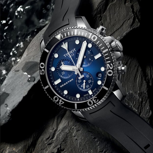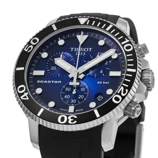 Кварцевые водонепроницаемые часы 30 ATM Tissot SEASTAR 1000 Chrono 45.5 мм с градиентным циферблатом и черным ремешком. Seastar 1000 сочетают стиль и производительность, не жертвуя ни тем, ни другим. Вдохновение дайверскими традициями сформировало как внешний вид, так и функциональность этих часов. Они сохраняют свои характеристики в отношении водонепроницаемости до 300 м/1000 футов. Дайверская тема находит свое продолжение в таких элементах, как однонаправленно вращающийся безель, прочный ремешок, а также люминесцентные стрелки и метки.