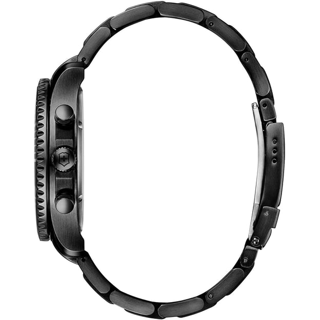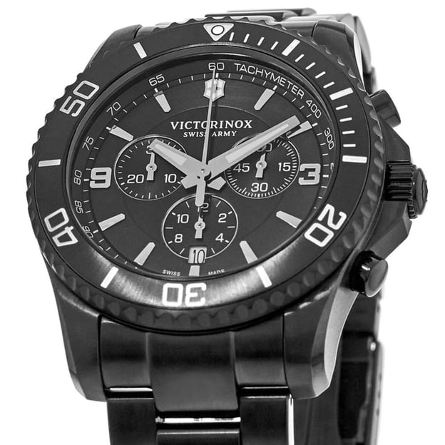 Victorinox MAVERICK Chrono V241797 - кварцевые часы-хронограф 43 мм в стальном дизайне с полным PVD-покрытием черного цвета. Эти водонепроницаемые часы с хронографом, датой и тахиметром остаются верными морской стихии: обладают спортивным силуэтом в стиле дайверских часов и благородным происхождением, благодаря чему отлично адаптируются к повседневным вызовам. Мужественный браслет, достачно большой диаметр стального корпуса и высокий класс водозащиты. Точный швейцарский механизм с функцией хронографа. Быстрое управление хронографом возложено на две кнопки на корпусе: верхняя - запуск/стоп стрелки хронографа; нижняя – сброс значений.