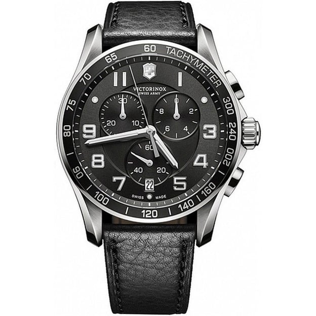 Victorinox V241651 - мужские швейцарские часы-хронограф CHRONO CLASSIC XLS на черном кожаном ремешке. Как и следует из названия коллекции, часы оборудованы кварцевым хронографом и обладают достаточно большим диаметром корпуса 45 мм. И все это с высокой производительностью, точностью и высоким классом водонепроницаемости до 100 метров от лучших швейцарских часовщиков. Хронограф - максимальная точность измерения времени до десятых секунды, поэтому удобно использовать в роли аналогового секундомера. Шкала тахиметра (на безеле) служит для измерения скорости объекта с равномерным темпом движения: запустите стрелку хронографа, преодолейте в равномерном темпе 1 км и на тахиметрической шкале стрелка укажет вашу скорость движения в км/час. Использована гипоаллергенная нержавеющая сталь 316L, которая замечательно поглощает удары, высокая антимагнитность и антикоррозийность, поэтому часы будут радовать вас многие годы эстетичным внешним видом и точностью.
