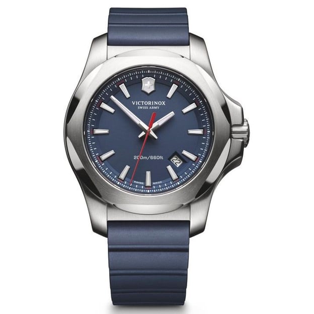 Victorinox V241688.1 - экстремально прочные стальные часы I.N.O.X. на синем резиновом ремешке. Модель из коллекции, которая была выпущена к 130-летию компании и отличается рекордной прочностью. Кварцевые модели серии прошли 130 различных тестов на выносливость и прочность, во время которых часы замораживали и резко размораживали, сбрасывали с высоты, ездили по ним бульдозером, поэтому к ежедневным вызовам эти часы точно готовы.