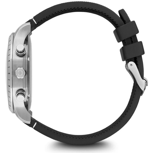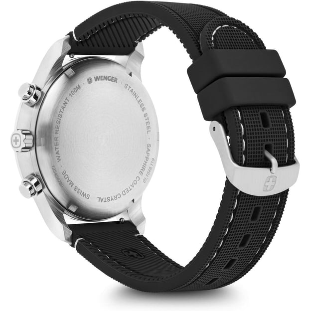 Большие кварцевые часы имеют диаметр 44 мм, что делает их отличным выбором для мужчин, которые ценят спортивный стиль. Два формата времени и четкая разметка для всех единиц измерения. Хронограф является невероятно точным аналоговым секундомером. А телеметр предназначен для измерения приблизительного расстояния до источника звука, то есть скорости распространения звуковых волн в воздухе. Водонепроницаемость до 10 АТМ позволяет не снимать часы во время водных активностей, но не подходит для дайвинга. Благодаря задней крышке с завинчивающейся конструкцией, часы имеют дополнительную герметичность. Часы Wenger представляют непревзойденный уровень качества и функциональности благодаря знаку SWISS MADE.