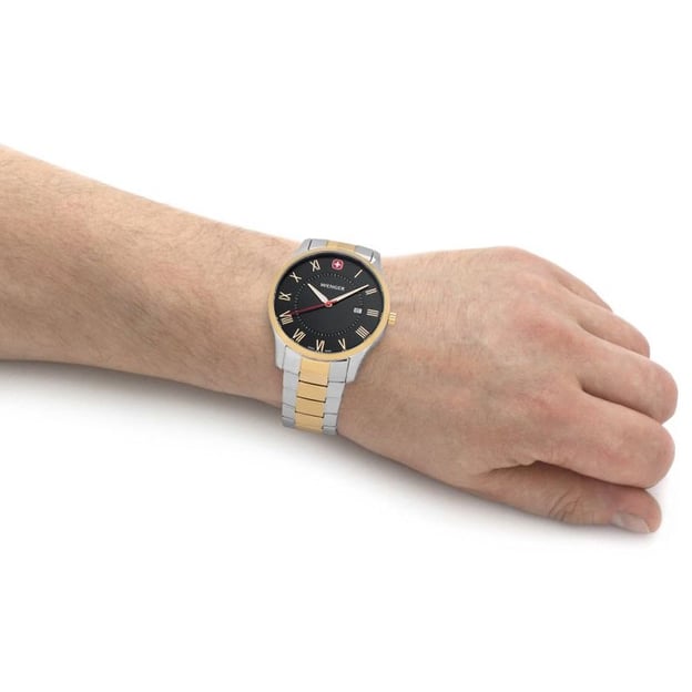 Мужские кварцевые часы Wenger CITY CLASSIC W01.1441.142 в стальном двухцветном дизайне с черным циферблатом. Швейцарские изысканные часы для мужчин, которые ищут элегантный и классический стиль. Эти часы могут быть идеальным дополнением к любому образу, от повседневного до официального.
