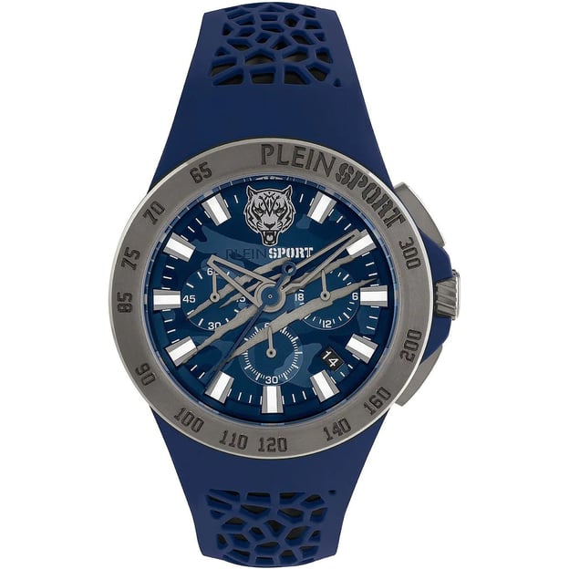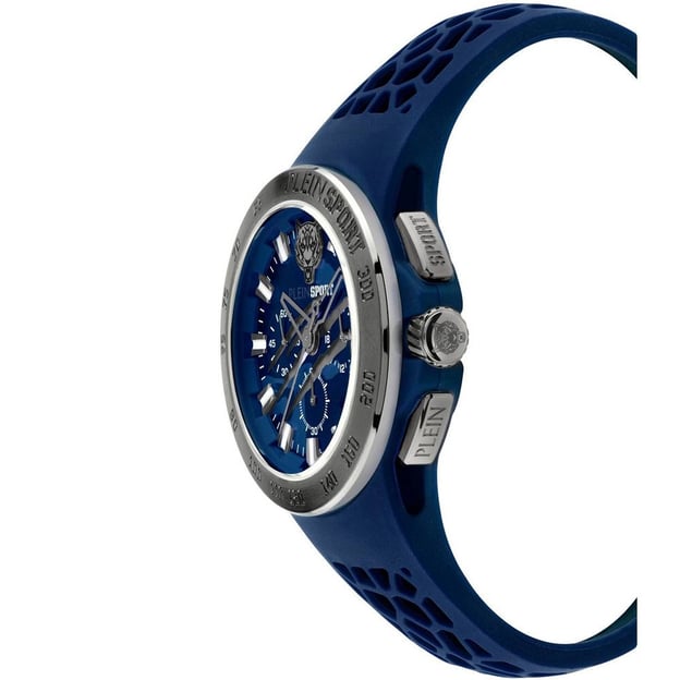 Plein Sport Thunderstorm PSABA0223 — мужской хронограф с выразительным синим циферблатом и черным корпусом из нержавеющей стали. Кварцевый механизм дает точный ход, а аналоговая индикация читается привычно и быстро.