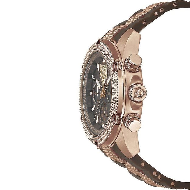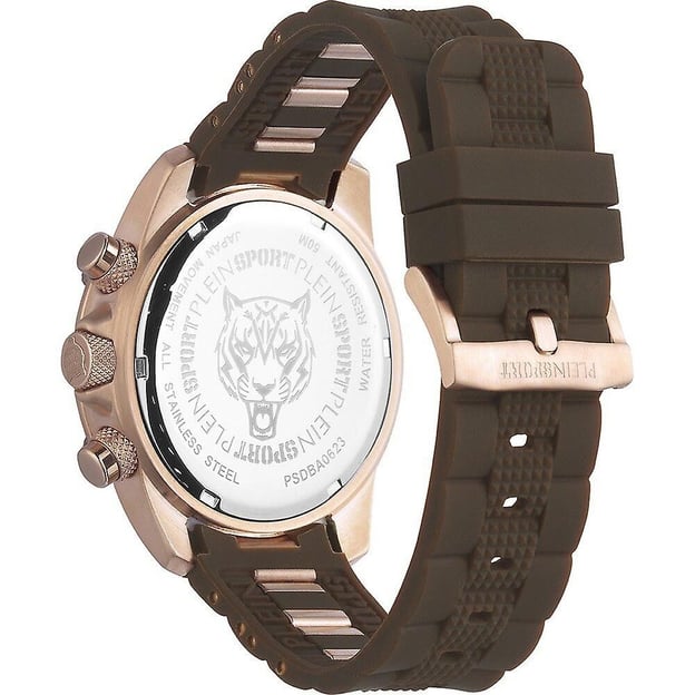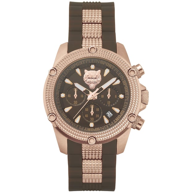 Plein Sport Hurricane PSDBA0623 — мужской хронограф с выразительным коричневым циферблатом и корпусом в оттенке розового золота. Круглый корпус из нержавеющей стали диаметром 44 мм смотрится уверенно на руке, а коричневый силиконовый ремешок делает посадку комфортной и практичной на каждый день.