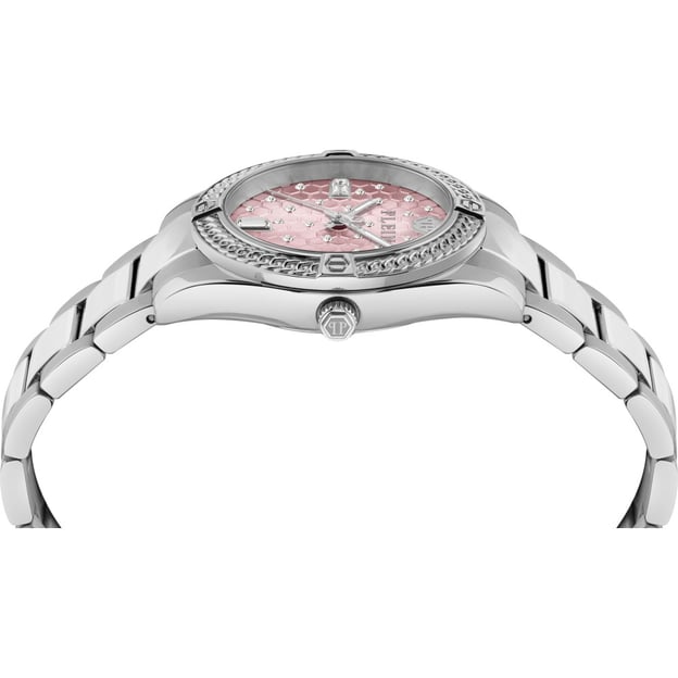Philipp Plein Plein Icon Chain PW1FA0125 — женские часы с выразительным розовым циферблатом в круглом стальном корпусе. Серебристые корпус и браслет из нержавеющей стали выглядят стильно и аккуратно, а минеральное стекло помогает защитить циферблат от повседневных мелких царапин.