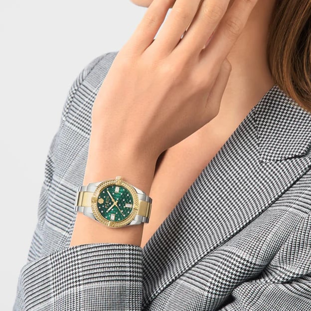 Женские часы Philipp Plein Plein Icon Chain PW1FA0325 — аккуратная модель с круглым корпусом 36 мм и браслетом из нержавеющей стали в сочетании стального и золотого оттенков. Зеленый циферблат добавляет выразительный акцент, при этом дизайн остается сдержанным и легко сочетается с повседневным гардеробом.