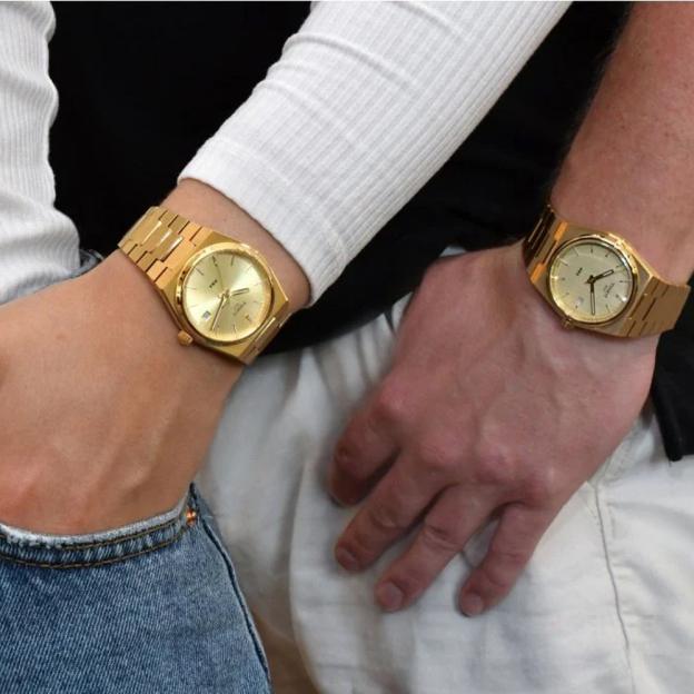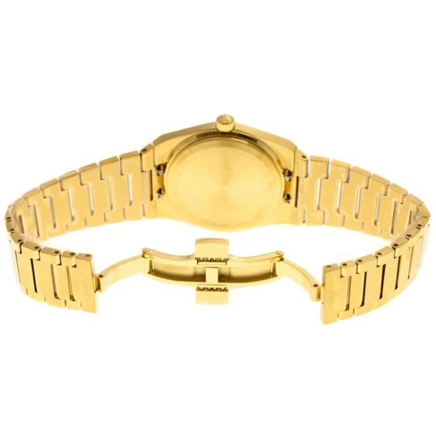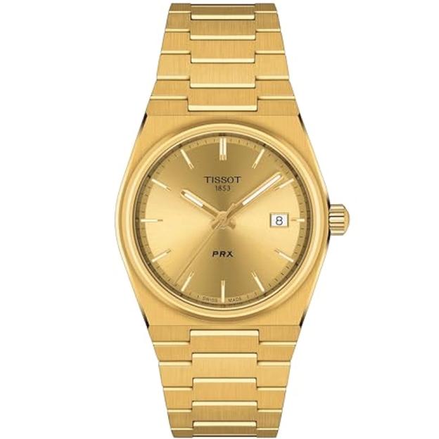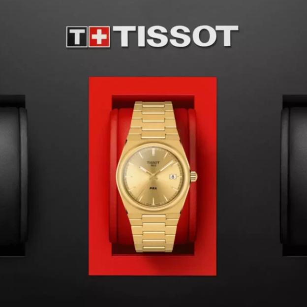 Кварцевые часы Tissot PRX T137.210.33.021.00 привлекают внимание своим необычным бочкообразным корпусом и оригинальным креплением браслета. Корпус и браслет из нержавеющей стали с PVD-покрытием цвета желтого золота. Золотистый, минималистичный циферблат защищен прочным сапфировым стеклом, устойчивым к царапинам. Модель T1372103302100 работает на швейцарском кварцевом механизме ETA F05.115 с питанием от батарейки и тремя камнями. Часы отображают время и дату, расположенную на отметке «3 часа». Часовая и минутная стрелки, а также часовые метки имеют люминесцентное покрытие, что облегчает считывание времени в темноте. Функция EOL (End of Life) предупреждает о необходимости замены батарейки.