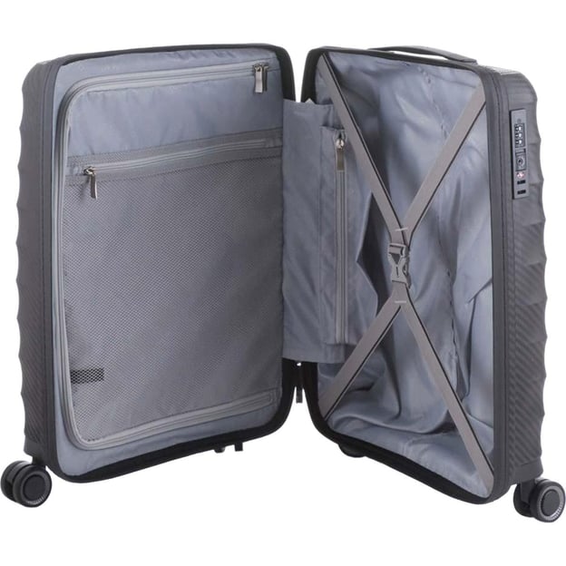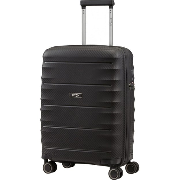 Titan HIGHLIGHT/Black Маленький (40 x 55 x 20 см / 38 л / черный) - крепкий и легкий чемодан небольшого размера с кодовым замком TSA для поездок на 1-3 дня. Изобретательный и урбанистичный багаж, который сопроводит Вас в любой поездке. Ударопрочная оболочка из полипропилена с имитацией карбона. Можно спокойно перевозить чемодан полупустым и быть уверенными, что он не треснет и не разломается. Функциональное внутреннее пространство предлагает раздельную упаковку и надежную фиксацию вещей. Встроенный замок кодовой блокировки TSA предоставляет дополнительную безопасность и обязателен для безопасных таможенных досмотров. Система 4-х колес со сдвоенными дисками. Быстрые колеса обеспечивают уверенность передвижений и преодоление разных поверхностей.