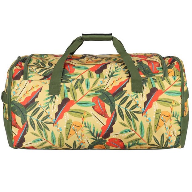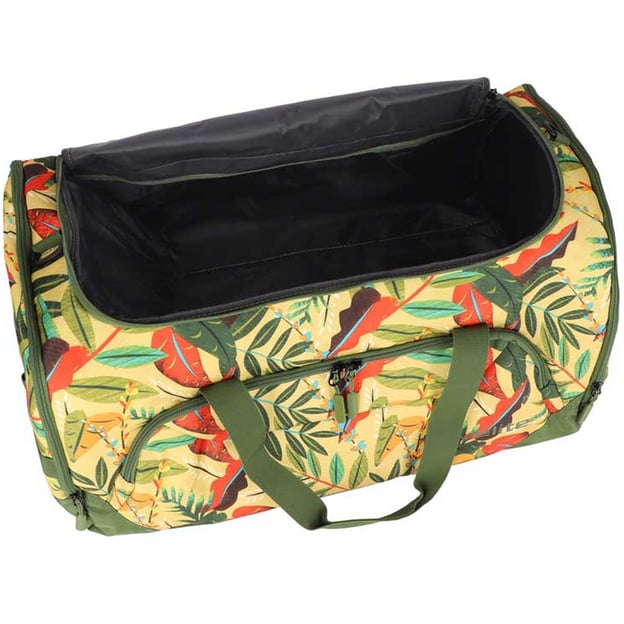 Travelite Kick Off 69 Jungle (зеленая с принтом; 73 литра) - яркая и функциональная дорожная сумка для спорта и отдыха. Модель изготовлена из прочного полиэстера, который прост в очистке и совершенно неприхотлив в уходе. Для аксессуаров и вещей, которые должны быть в быстром доступе, есть передний карман на молнии. Также есть внутреннее отделение на молнии для ценных вещей. Для переноски сумки есть две удобные удлиненные ручки с мягким фиксатором, на боковых карманах расположены дополнительные ручки, а также в комплекте есть длинный плечевой ремень.