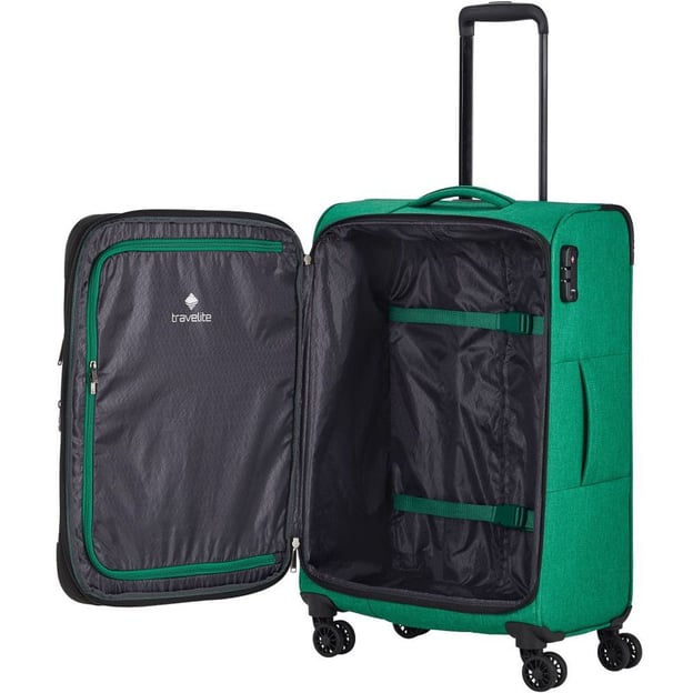 Travelite ADRIA TL080248 (полиэстер / зеленый / 67х42х27-31 см / 60-66 л) - 4-колесный текстильный чемодан среднего размера с расширением и большим передним отделением. Просторное и хорошо организованное место для транспортировки вещей. Прекрасная емкость на все случаи жизни. Благодаря возможности увеличить размер, вы можете смело собрать вещи для недельной поездки. А благодаря переднему отделению ваши посадочные билеты, легкая куртка или любимая книга всегда под рукой.