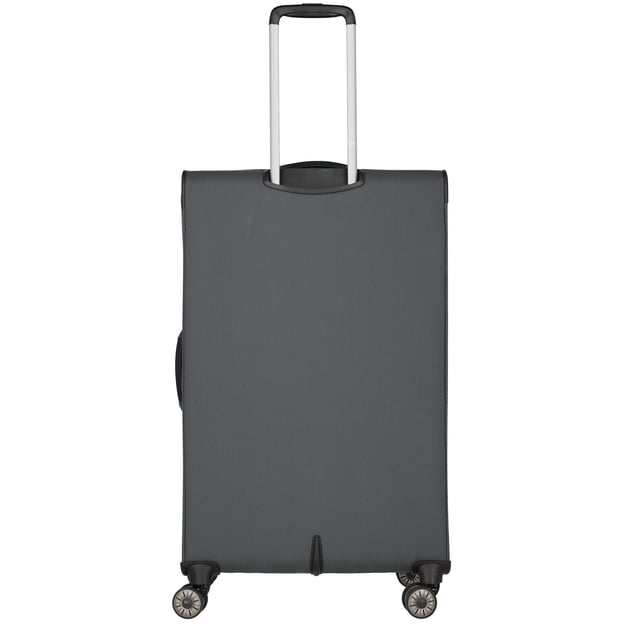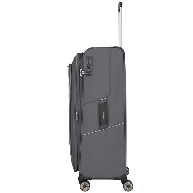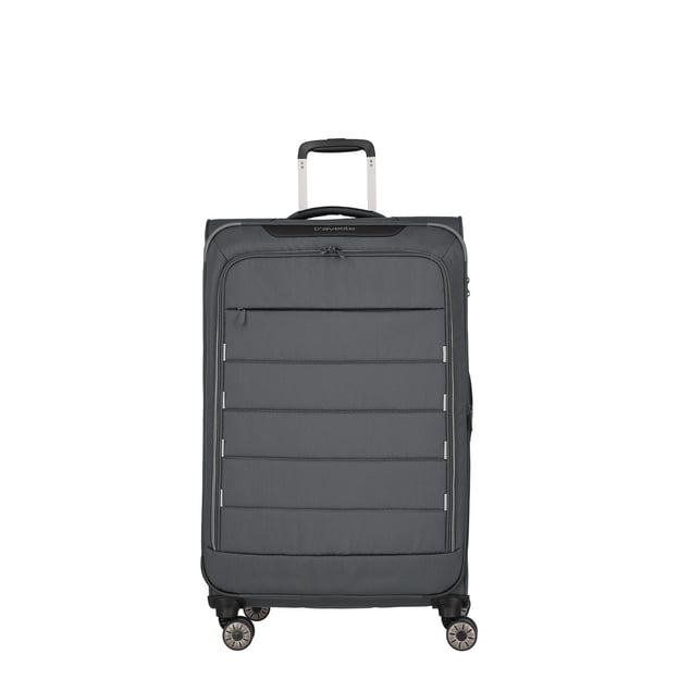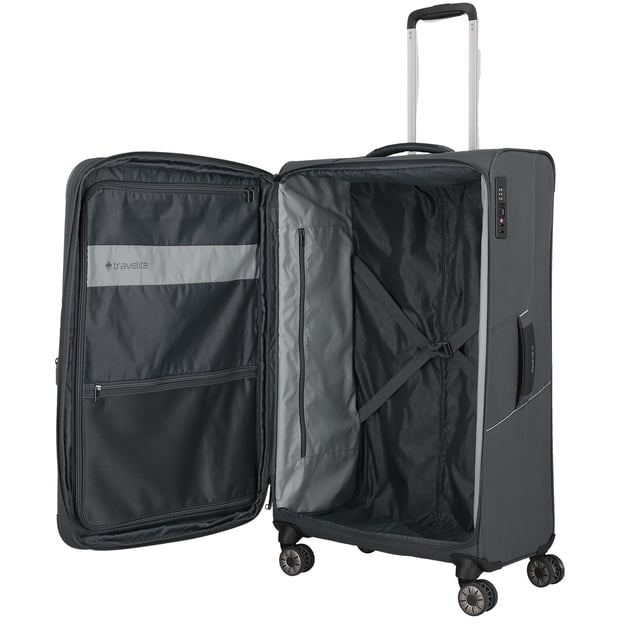 Travelite Skaii Anthracite L Большой (темно-серый; 91 литр) - большой и легкий чемодан на 4 колесах с хорошей вместительностью для множества вещей. Если Вы берете с собой в путешествие много багажа, Вам нужен чемодан с небольшим весом. Чемодан Skaii L весом всего 2,9 кг. Коллекция Skaii изготовлена из полиэфирной ткани, полученной из переработанных сертифицированных пластиковых отходов. Таким образом, в цикл не попадает новый пластик. Чемодан Skaii L позволяет увеличить объем корпуса в кратчайшие сроки, благодаря практической расширительной складке.