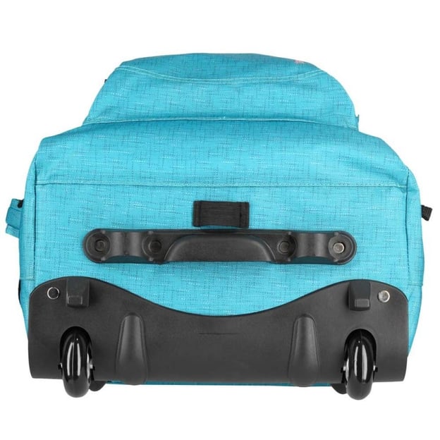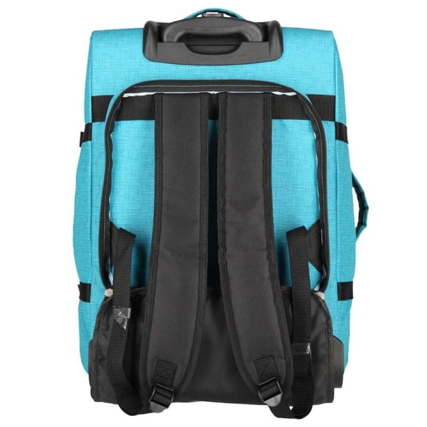 Основное отделение закрывается на молнию и двумя замками. Внутри главного отделения есть ремни для фиксации одежды. На передней стороне расположены два кармана на молнии: один обычный и один органайзер с отделениями для карточек, ручек и небольших предметов. Боковые стороны оснащены стягивающими ремнями. Для переноски предусмотрены ручки сверху и сбоку, а также выдвижная телескопическая ручка с фиксатором. На задней стороне имеются регулируемые и уплотненные плечевые лямки, которые можно спрятать.