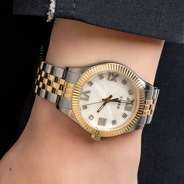 Женские часы Timex LEGACY Tx2v45600 - элегантная модель на серебристо-золотистом стальном браслете. Зеленый циферблат с камнями Swarovski и блестящие римские цифры придают часам особый шарм. Благодаря люминесцентным вставкам на стрелках светящихся в темноте, время легко считывать и днем, и ночью.