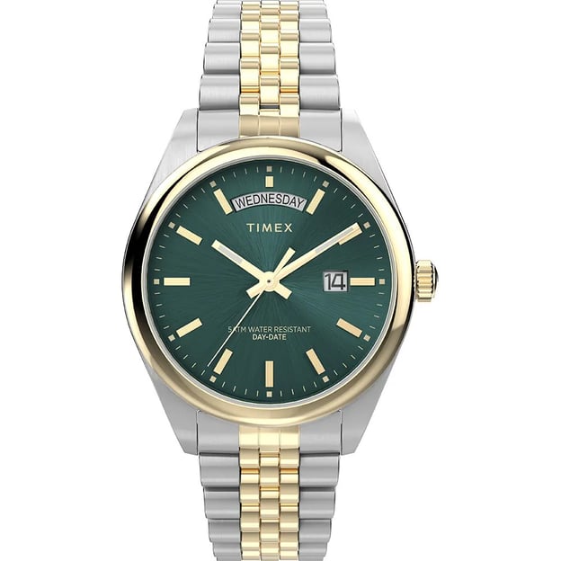 Мужские часы Timex LEGACY Tx2w42800 - серебристо-золотистая стальная модель с зеленым циферблатом. Новый взгляд на традиционные часы Timex Legacy. Эта вневременная модель сочетает современное часовое искусство с удобными пропорциями и насыщенным синим циферблатом. Timex добавили простой индикатор с полным указанием названия дня недели в положении «12 часов» и увеличенным окошком даты в положении «3 часа». Это универсальные часы с изысканным браслетом, безелем и корпусом из нержавеющей стали — свидетельство богатого наследия Timex. Хорошо подходит для повседневной носки и особых случаев.