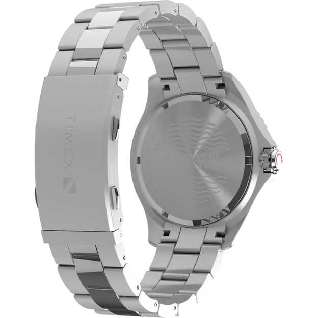 Водонепроницаемые часы Timex DEEP WATER Meridian Tx2w81900 с синим циферблатом. Предназначены для тех, кто стремится соединить элегантность и выносливость в повседневной жизни и во время погружений. Массивный корпус диаметром 44 мм из нержавеющей стали обеспечивает прочность и стойкость к давлению воды, а завинчивающаяся заводная головка и задняя крышка гарантируют герметичность до 200 метров. Синий алюминиевый безель вращается только в одну сторону, позволяя точно отслеживать время погружения. Циферблат с волнообразным узором в глубоком синем цвете дополнен люминесцентным покрытием Super-LumiNova® на стрелках, метках и индикаторе безеля, что обеспечивает отличную видимость даже в темноте. Сапфировое стекло с антибликовым покрытием добавляет прозрачности и защищает от царапин, а функция даты с увеличительной линзой делает часы еще более практичными. Стальной браслет с матово-полированной отделкой оснащен удлинителем, что позволяет носить часы поверх гидрокостюма.