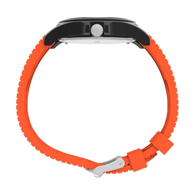 - Ремешок: оранжевый ремешок 20 мм из силикона с тисненым рисунком, застежка – пряжка. Подходит для запястья обхватом 150–205 мм.