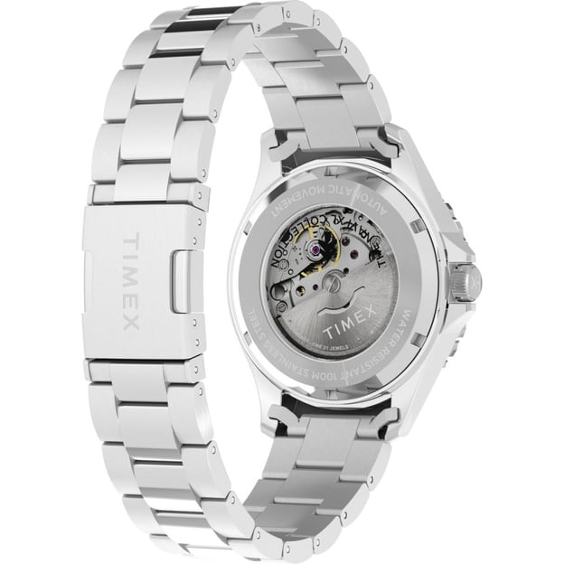 Мужские часы Timex NAVI Automatic совмещают мощный дизайн с современной функциональностью. Массивный корпус диаметром 41 мм из нержавеющей стали и браслет из матово-полированной стали создают ощущение прочности и элегантности. Храповый безель и защита заводной головки подчеркивают его спортивный характер, а прозрачная задняя крышка позволяет наблюдать за работой японского автоматического механизма с 21 камнем. Зеленый циферблат с эффектом солнечных лучей выглядит выразительно. Большие люминесцентные метки и стрелки обеспечивают отличную читабельность, а дополнительные 24-часовые цифры в центре добавляют практичности. Увеличенное окошко даты делает часы еще более удобными в ежедневном использовании.
