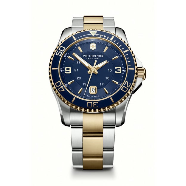 Victorinox V241789 - водонепроницаемые кварцевые часы MAVERICK Large с синим циферблатом и золотисто-серебристым стальным браслетом. Контрастное сочетание цветов для мужчин, выбирающих нескучную элегантность. Швейцарский механизм, ставший воплощением надежности и точности. Досточно крупный корпус диаметром 43 мм из высококачественной стали, функция даты, светонакопительная индикация Super-LumiNova®, мужественный браслет и множество деталей, которые отсылают нас к стилю дайверских часов: от однонаправленно вращающегося безеля до застежки с двойной блокировкой. А большой срок гарантии говорит об уверенности бренда в высоком качестве своих часов.