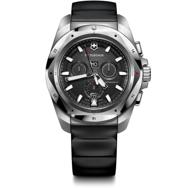 Victorinox V241983 - швейцарские кварцевые часы-хронограф I.N.O.X. Chrono на черном резиновом ремешке. INOX Chrono продолжает захватывающую новую эру часов серии INOX моделями с хронографом. А дополнительные функции тахиметра, даты и дня недели помогут контроливать каждую секунду. Обновленные модели все так же обладают фирменным безелем, который выглядит так, как будто его вырезали острым ножом. Резные формы, строгие геометрические формы, дерзкий и мужественный дизайн. Антимагнитная защита позволяет избежать неточностей времени из-за влияния электромагнитных волн. Сертифицированы по стандарту ISO ударо- и водонепроницаемость. Корпус и безель на 60-70% состоят из переработанной нержавеющей стали. Victorinox гордо заяаляют, что часы разработаны, изготовлены и испытаны на их собственном заводе в Швейцарии.