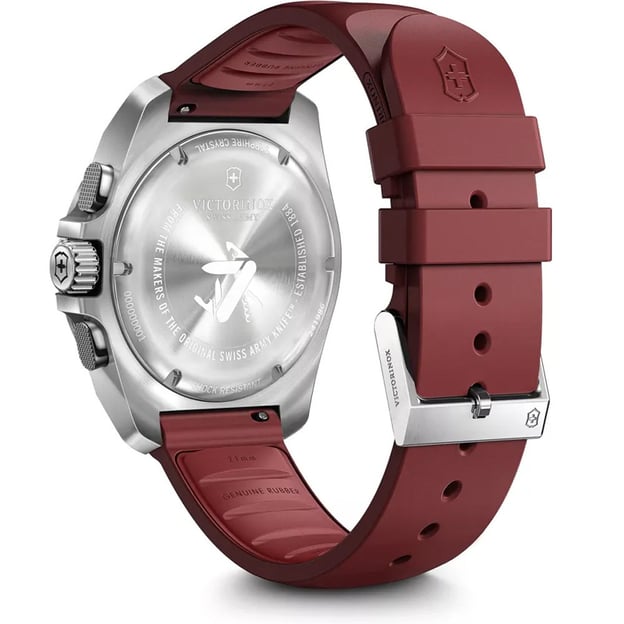 Victorinox V241986 - швейцарские кварцевые часы-хронограф I.N.O.X. Chrono на красном резиновом ремешке. INOX Chrono продолжает захватывающую новую эру часов серии INOX моделями с хронографом. А дополнительные функции тахиметра, даты и дня недели помогут контроливать каждую секунду. Обновленные модели все так же обладают фирменным безелем, который выглядит так, как будто его вырезали острым ножом. Резные формы, строгие геометрические формы, дерзкий и мужественный дизайн. Антимагнитная защита позволяет избежать неточностей времени из-за влияния электромагнитных волн. Сертифицированы по стандарту ISO ударо- и водонепроницаемость. Корпус и безель на 60-70% состоят из переработанной нержавеющей стали. Victorinox гордо заяаляют, что часы разработаны, изготовлены и испытаны на их собственном заводе в Швейцарии.