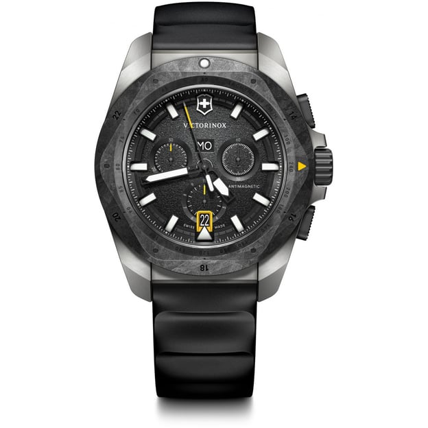 Victorinox V242011 - титановые кварцевые часы-хронограф I.N.O.X. Chrono с карбоновым безелем и черным спортивным ремешком. INOX Chrono продолжает захватывающую новую эру часов серии INOX моделями с хронографом. Сочетание прочности и комфорта в носке благодаря использованию титана, который характеризуется прочностью, выносливостью, низкой теплопроводимостью и все это при гораздо легком весе в сравнении со стальными моделями. А дополнительные функции тахиметра, даты и дня недели помогут контроливать каждую секунду. Обновленные модели все так же обладают фирменным безелем, который выглядит так, как будто его вырезали острым ножом. Резные формы, строгие геометрические формы, дерзкий и мужественный дизайн. Антимагнитная защита позволяет избежать неточностей времени из-за влияния электромагнитных волн. Сертифицированы по стандарту ISO ударо- и водонепроницаемость. Victorinox гордо заяаляют, что часы разработаны, изготовлены и испытаны на их собственном заводе в Швейцарии.