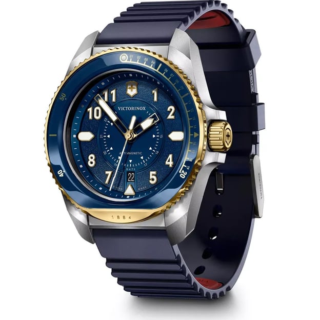 Victorinox V242013 - швейцарские кварцевые часы JOURNEY 1884 с синим резиновым ремешком и алюминиевым безелем с золотым PVD. Коллекция Journey 1884 знаменует собой новую эру часов Victorinox. Каждая деталь имеет смысл и рассказывает о легендарной истории бренда. Универсальность и удобство ношения, эти часы становятся идеальным партнером на все времена. Victorinox гордо заявляют, что часы спроектированы, разрабатаны, протестированы и изготовлены на их собственной фабрике в Делемоне (Швейцария). Безупречный дизайн и техническое совершенство благодаря сертифицированной по ISO ударопрочности и водостойкости. Антимагнитная защита защищает кварцевый механизм от магнитных полей, гарантируя точность хода.
