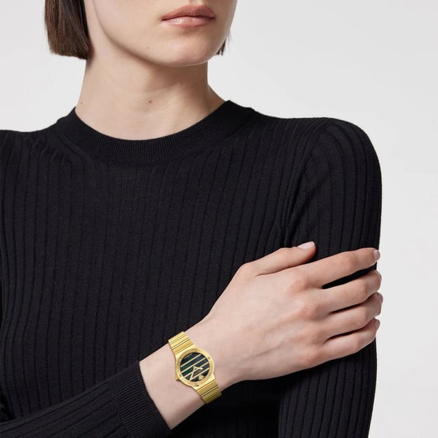 За точность отвечает кварцевый механизм, индикация — классическая аналоговая. Сапфировое стекло устойчиво к повседневным царапинам, а корпус и браслет из нержавеющей стали выполнены в едином золотистом тоне. Водозащита 3 ATM (30 м) рассчитана на обычные бытовые контакты с водой, без погружений.