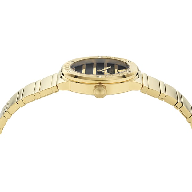 Женские часы Versace Greca Logo Pearl VE0S00525 — декоративная модель с выразительным, но аккуратным дизайном. Перламутровый циферблат мягко играет на свету и хорошо сочетается с золотистым корпусом круглой формы диаметром 33 мм.