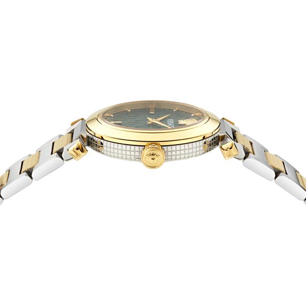 VERSACE GREEK Vre5b00525 — женские часы из нержавеющей стали с элегантным серебристо-золотым браслетом. Корпус диаметром 35 мм и зеленый циферблат оформлены фирменным орнаментом Greca, подчеркивающим узнаваемый стиль бренда. Модель работает на швейцарском кварцевом механизме с двумя стрелками. В верхней части циферблата, на отметке 12 часов, расположены логотип бренда и культовая голова Медузы.