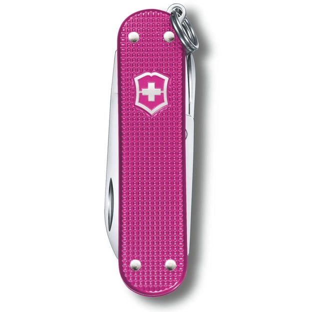 Victorinox CLASSIC SD Alox Colors 0.6221.251G - оригинальный нож-брелок из коллекции Classic Colors 2021 года представлен в 30 разных цветах. Стильный дизайн накладок в темно-розовом цвете Flamingo Party выполнены из рифленого анодированного алюминия и фирменным логотипом, которые надежно защищают от коррозии и механических повреждений. Благодаря этой обработке, рукоять становится более устойчива к воздействию воды и деформации. Рифленая поверхность обеспечивает противоскользящий эффект, что делает складной нож удобным и безопасным в использовании.