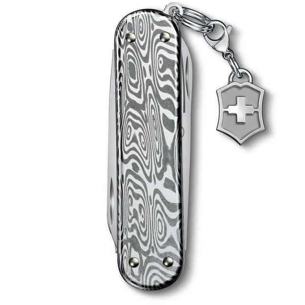 Victorinox CLASSIC SD Brilliant Damast 0.6221.34 - швейцарский складной нож 58 мм на 5 функций. Истинное произведение искусства с уникальными накладками серебристо-черного цвета из дамасской стали. Накладки созданы с применением запатентованной продукции порошковой металлургии, обеспечивая высочайшую чистоту без добавок, непревзойденную прочность и коррозийную стойкость. Эксклюзивный дизайн из линейки CLASSIC SD Brilliant, дополненный еще и съемным брелоком-логотипом. Ножик, пилочка, ножнички и маленькая отвертка - потому что не только стилем и эффектными накладками решили покорить нас Victorinox.