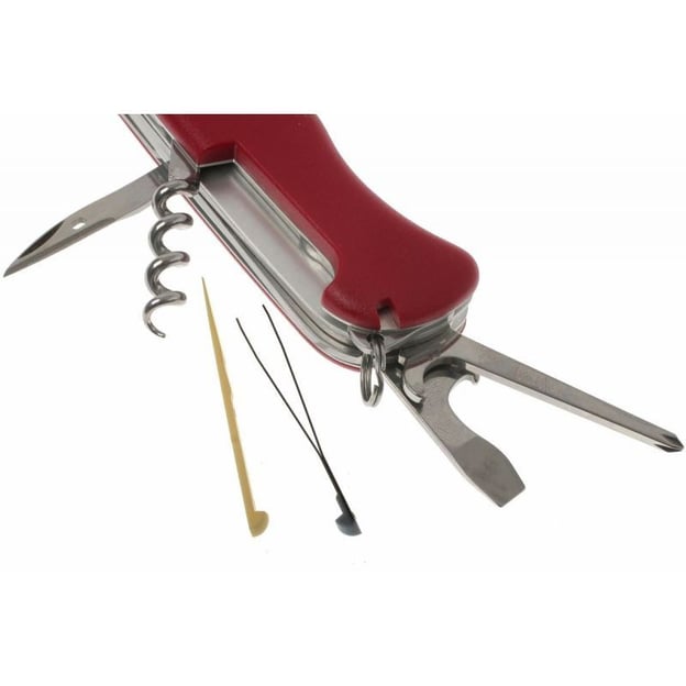 Victorinox OUTRIDER 0.9023 - складной швейцарский нож с красными накладками, предназначен для широкого спектра задач. Корпус изготовлен из прочного материала, что придает ему надежность и долговечность. Ручка имеет эргономичную форму, обеспечивая удобное и надежное удержание в руке. Несмотря на свою компактность, нож обладает значительным набором инструментов, включая лезвие, пилу, открывалку для бутылок и консервных банок, отвертки и многое другое. Этот богатый функционал делает мультитул многоцелевым инструментом, который пригодится для активных людей, занимающихся кемпингом, туризмом, рыбалкой или охотой. В набор входят:
