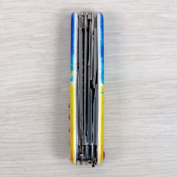 Victorinox HUNTSMAN UKRAINE 1.3713.7.T3100pw - стильный и функциональный складной нож, выполненный в уникальном дизайне с национальными мотивами. Накладки украшают яркие узоры, нанесённые с использованием стойкой цветной печати, а их поверхность покрыта глянцевым лаком, который придаёт изделию эффектный вид и защищает от повреждений.