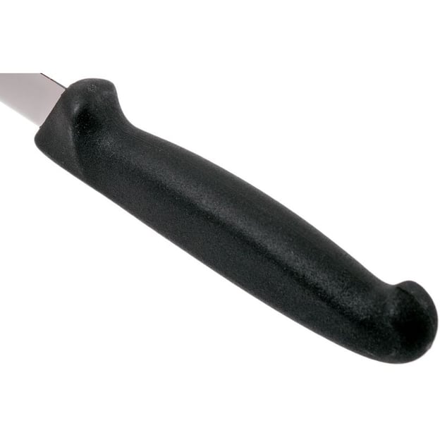 Рукоять изготовлена из прочного, износостойкого материала с шероховатым покрытием, обеспечивающим надежный хват даже при работе с влажными или жирными продуктами. В составе используется термопластичный эластомер, сочетающий в себе свойства вулканизированной резины, что делает рукоять устойчивой к износу, механическим нагрузкам и высоким температурам (до 110°C). Кроме того, материал препятствует развитию бактерий и плесени, полностью безопасен для контакта с пищевыми продуктами и подлежит вторичной переработке.