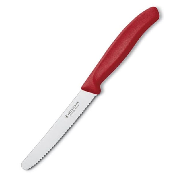 Victorinox SWISS CLASSIC Tomato&Sausage 6.7831 – кухонный нож с красной рукояткой и волнистым (серрейторным) лезвием длиной 11 см. Острая заточка позволяет с легкостью чистить и нарезать мягкие овощи, фрукты или свежую хрустящую выпечку. Закругленный кончик лезвия делает его удобным для аккуратного нанесения масла, джема или меда.