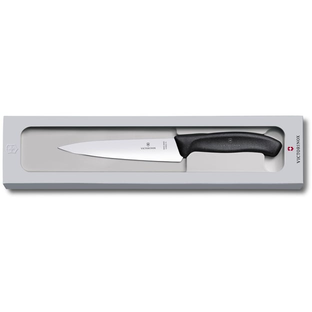 Victorinox SWISS CLASSIC Carving 6.8003.15G – универсальный кухонный нож от легендарного швейцарского бренда, сочетает в себе высокое качество, надежность и удобство использования. Клинок длиной 15 см выполнен из прочной нержавеющей стали, обладает исключительной стойкостью к коррозии, а также механическим нагрузкам. Гладкая режущая кромка (Plain) отлично справляется с нарезкой мяса, овощей, фруктов и других продуктов, позволяя делать аккуратные срезы без зазубрин. Благодаря высокоточному швейцарскому производству, лезвие долго сохраняет остроту. Эргономичная рукоятка изготовлена из термостойкого полимера с шероховатой поверхностью, которая предотвращает скольжение даже во влажных руках. Этот материал устойчив к износу, не впитывает влагу и запахи, а также препятствует размножению бактерий, что делает нож гигиеничным и долговечным. Лаконичный черный дизайн с фирменным логотипом Victorinox подчеркивает премиальный стиль инструмента.