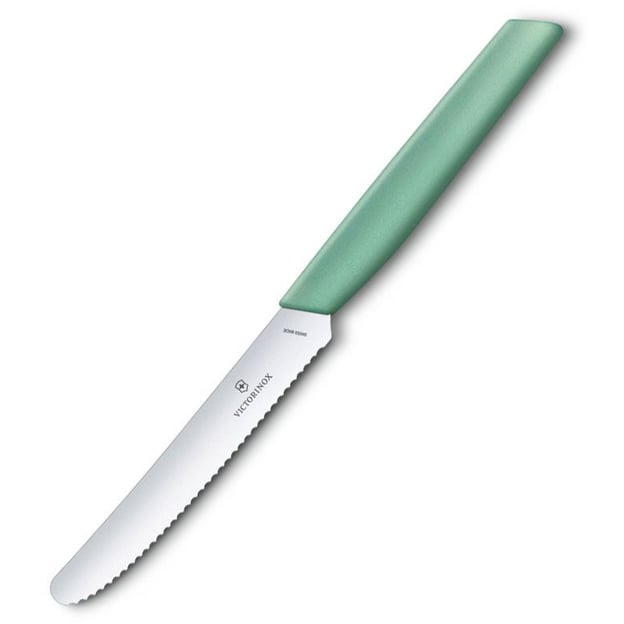 Идеальный помощник для работы с мягкими продуктами — Victorinox SWISS MODERN Tomato&Sausage 6.9006.11W41 создан для легкой и аккуратной нарезки. Этот нож сочетает в себе швейцарское качество, продуманный дизайн и удобство в использовании, делая его незаменимым инструментом на вашей кухне. Нож оснащен зубчатым лезвием длиной 11 см, изготовленным из высококачественной нержавеющей стали. Зубчатая кромка позволяет с легкостью разрезать продукты с твердой кожицей и мягкой сердцевиной — идеально подходит для нарезки томатов, колбас, хлеба и даже цитрусовых. Лезвие сохраняет остроту в течение длительного времени, обеспечивая чистый и ровный срез без раздавливания продукта. Яркая зеленая рукоятка выполнена из прочного полипропилена — материала, устойчивого к влаге, запахам и механическим повреждениям. Эргономичная форма обеспечивает надежный и комфортный хват, позволяя уверенно работать даже с мокрыми руками. Приятная на ощупь текстура предотвращает скольжение и делает использование ножа максимально комфортным.