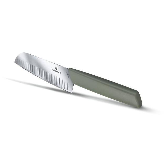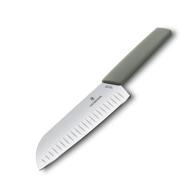 Victorinox SWISS MODERN Santoku 6.9056.17K6B – нож-сантоку с оливково-зеленой ручкой от Викторинокс, вдохновлен японскими драдициями. Лезвие длиной 17 см изготовлено из прочной нержавеющей стали, которое проходит многоэтапную закалку, обеспечивая исключительную остроту и долговечность. Уникальная рифленая кромка предотвращает прилипание продуктов и делает нарезку максимально точной и легкой. Эргономичная рукоять из полипропилена идеально лежит в руке, обеспечивая надежный хват и комфорт даже при интенсивной работе. Кухонный нож легко справляется с мясом, рыбой, фруктами и овощами — идеально для шинковки, нарезки и рубки. Каждое изделие Victorinox проходит строгую сертификацию по стандартам NSF и имеет пожизненную гарантию на заводской брак. Электронная гравировка на лезвии с фирменным логотипом Victorinox подтверждает подлинность и высокое качество инструмента.